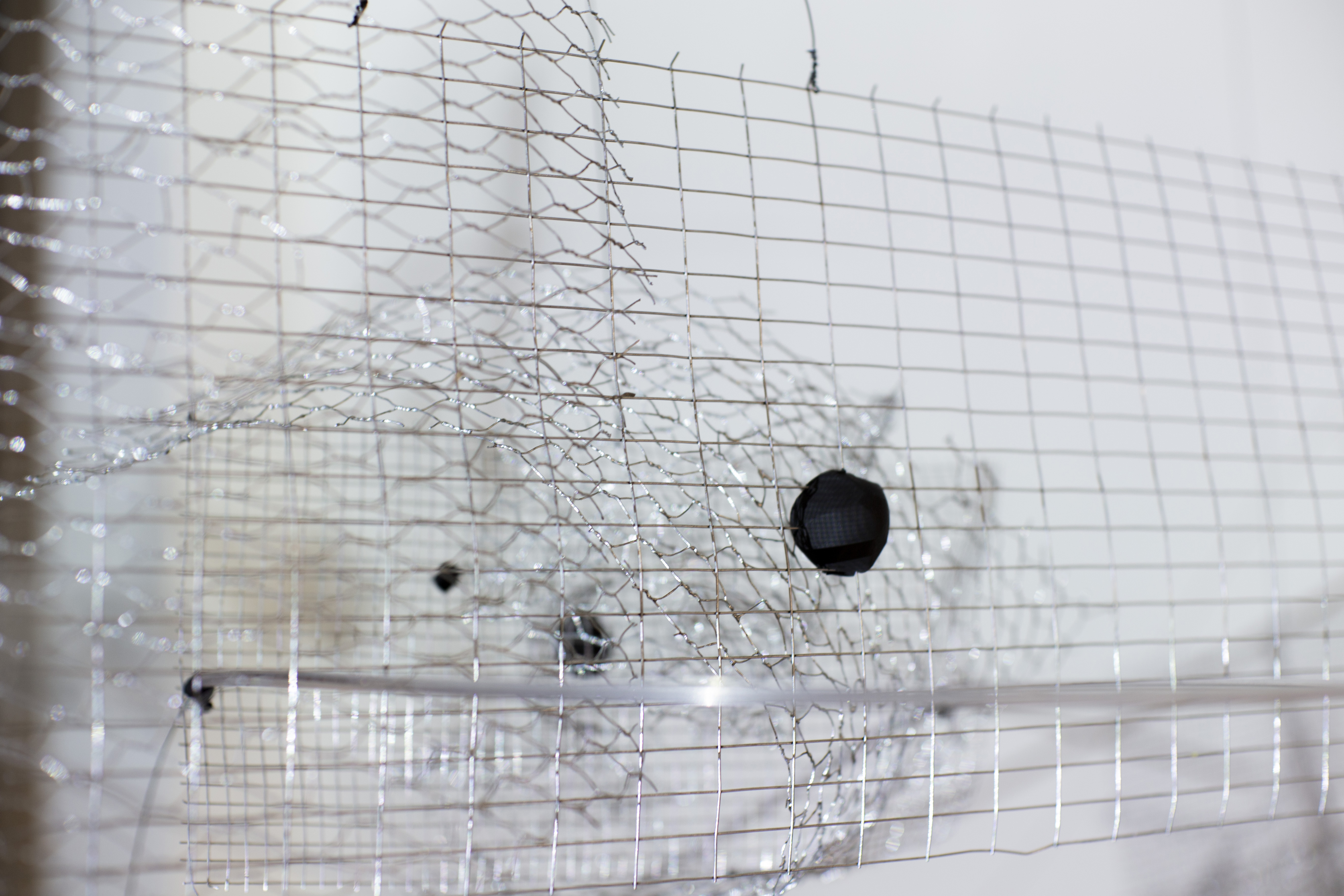 In this piece Metal is approached following philosopher Jane Bennett concept of an actant, a non-human agent having its own force and vitality. The hanging sculpture is an experimentation with the complex behaviours of matter to embody the paradoxes involved in a structure in which small localities, cluster, fine meshes and nodes act as shaping entities, holding the flow of long distance connections that link complex ecosystems together and allow them to exist in a double reciprocal movement.